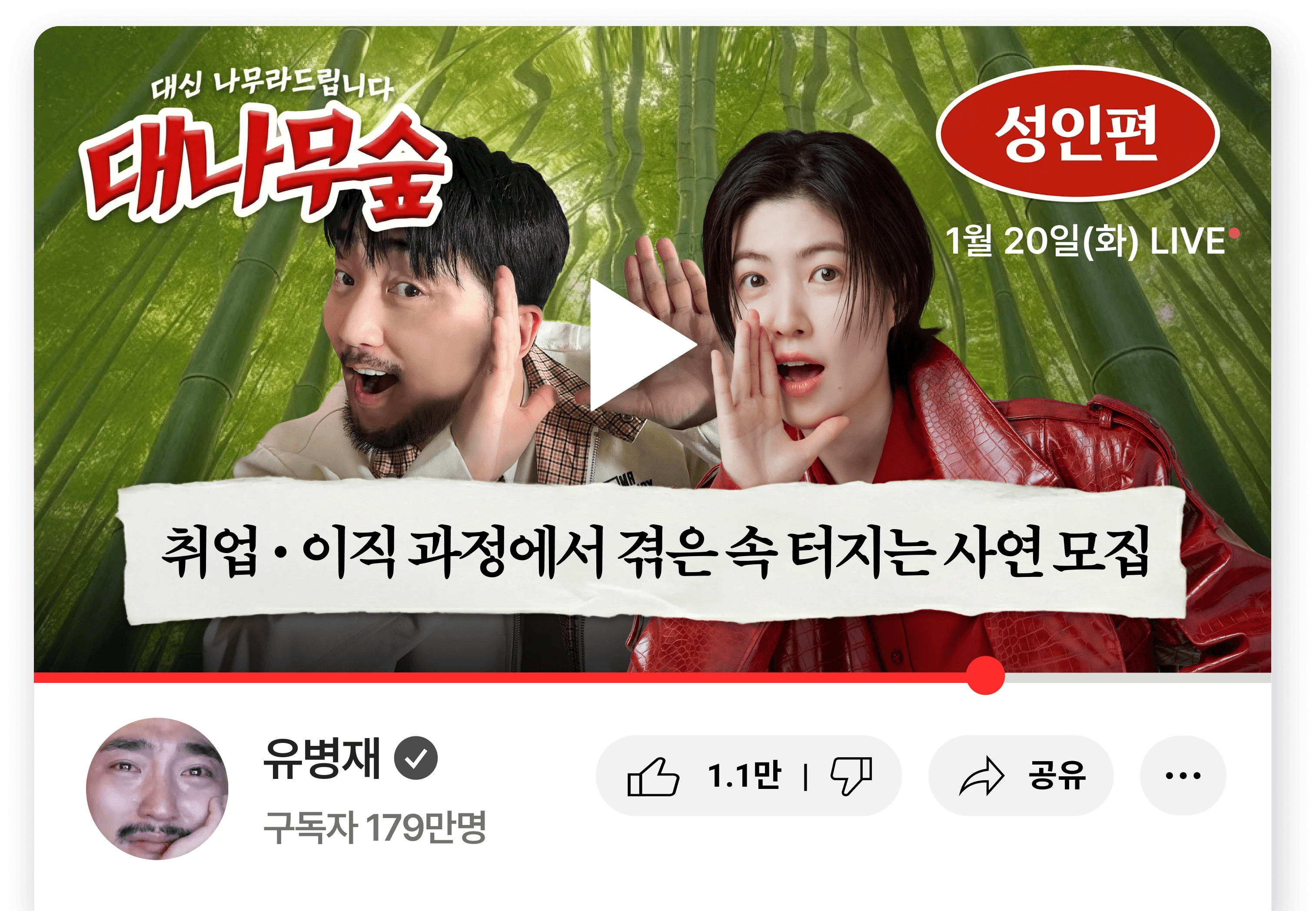 제출하신 사연은 유병재 유튜브 채널 ‘대나무숲’ 콘텐츠 제작에 활용될 수 있습니다.