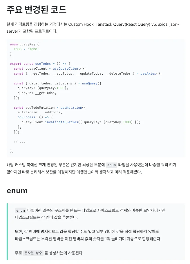 리팩토링하며 변경한 핵심 키워드로 enum과 interface의 개념을 정리하고, 예시 코드를 통해 어떤 형태를 가졌는지, 이 코드를 사용하는 효과는 무엇인지에 대해 정리해 주셨습니다.