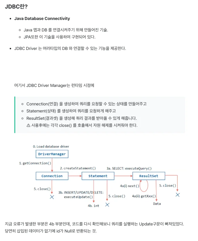 따라서 코드를 하나하나 따라가며 오류의 원인을 찾기 위해 주석을 달고, 보내는 쿼리문과 연결문을 수정했습니다. 원래 test 코드에서는 반환되는 id 값이 존재해야 했지만, 어떤 이유로 인해 제대로 작동하지 않았습니다. 글쓴이는 JDBC의 동작 순서를 상기시키기 위해 복기해보면서 오류의 원인을 찾으려고 노력했습니다. JDBC는 Java 앱과 DB를 연결하기 위해 만들어진 기술로, JDBC Driver Manager는 런타임 시점에 Connection(연결), Statement(상태), ResultSet(결과셋)을 생성하여 쿼리를 요청하고 결과를 받아올 수 있게 해줍니다. 그리고 사용 후에는 각각 close()를 호출하여 자원을 해제해야 합니다. 오류가 발생한 부분은 4b 부분인데, 코드를 다시 확인해보니 쿼리를 실행하는 Update 구문이 빠져있었습니다. 따라서 데이터가 삽입되지 않아 id가 null로 반환되는 것이었습니다.