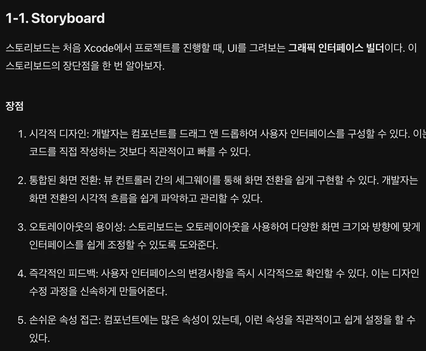구글로 검색해보시면 아시겠지만 실제로 많은 분들이 면접에서 받고 있는 질문인 Storyboard를 이용했을 때의 장단점, 코드로 UI를 그렸을 때의 장단점을 잘 정리해주고 있습니다. 금주 우수 TIL은 해당 기술에 대한 정리의 '필요성'을 느끼고 일목요연하게 정리해주신 홍준영님의 글입니다.