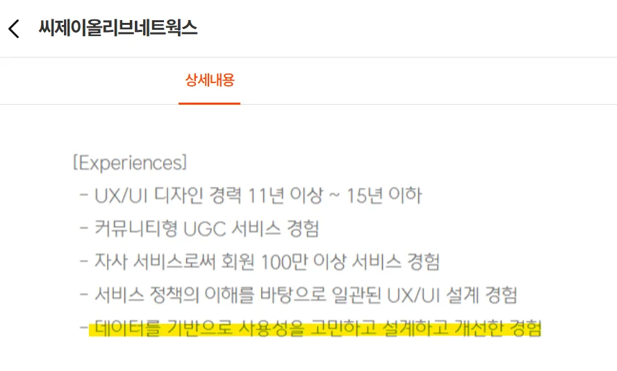 출처. 인크루트 | CJ ONE UI/UX 디자이너 채용 공고(https://job.incruit.com/jobdb_info/jobpost.asp?job=2507160002030)