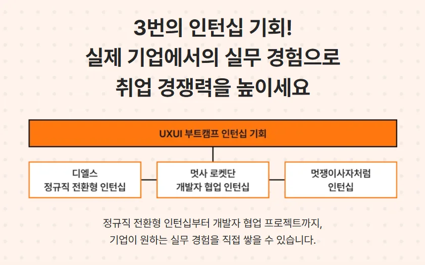 먼저 멋쟁이사자처럼 UIUX 부트캠프 과정을 살펴보겠습니다. 멋쟁이사자처럼 UIUX 부트캠프의 특징은 총 3번의 인턴십 기회를 제공한다는 건데요! 자세히 살펴볼게요.