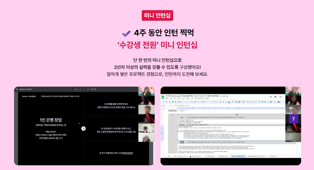 또한, 4주 동안 짧게 인턴 경험을 해볼 수 있는 ‘미니 인턴십’을 수강생 전원에게 제공합니다. 부트캠프 기간 동안은 상주 코치의 1:1 멘토링을 통해 포트폴리오 코칭과 피드백을 진행해요.